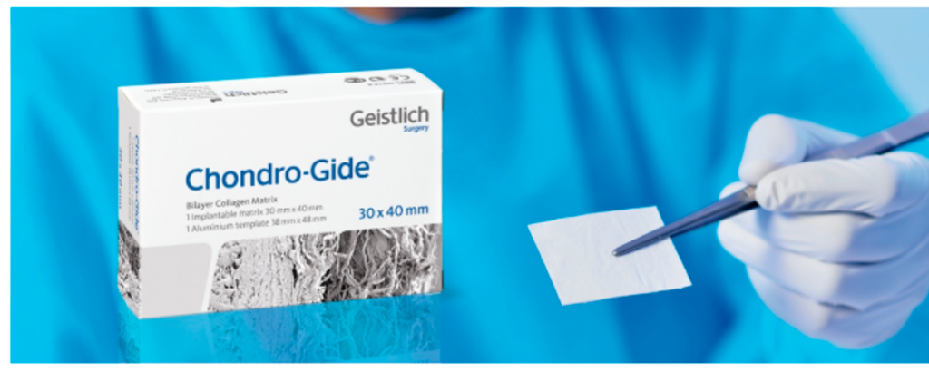 Chama-se Chondro-Glide, é feita na Suiça pela empresa de biotecnologia Geistlich e tem duas camadas de membrana de colágeno que auxilia na formação da cartilagem . Ela está sendo indicada por especialistas em joelho para tratamento de lesões maiores de 1 cm 2.