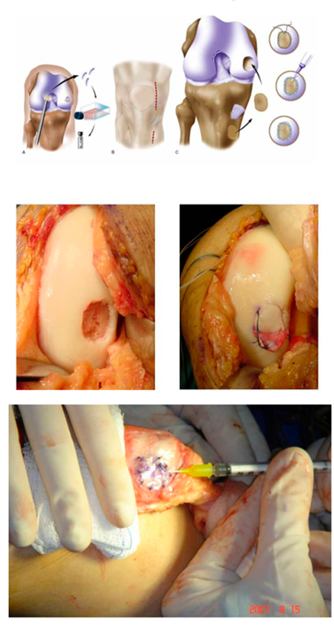 Lesões maiores que 3 cm superficiais: cultura de condrócitos ou de célula tronco. Desenho esquemático da coleta de células e reimplantação, lesões no fêmur e na patela cobertas com células de condrócitos previamente cultivados e membrana de colágeno.