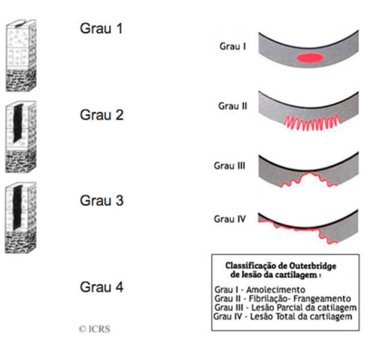 As lesões de cartilagem do joelho são classificadas quanto ao tamanho e a profundidade(classificação da sociedade internacional de reparação de cartilagem-ICRS):