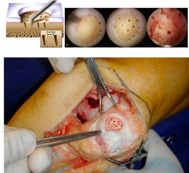 Lesões até 1 cm: debridamento e microfraturas. Fazemos a curetagem da lesão e microperfurações para que as células de cicatrização venham do osso profundo para ajudar no reparo da cartilagem. A cirurgia pode ser feita por vídeo artroscopia ou aberta dependendo do local da lesão.