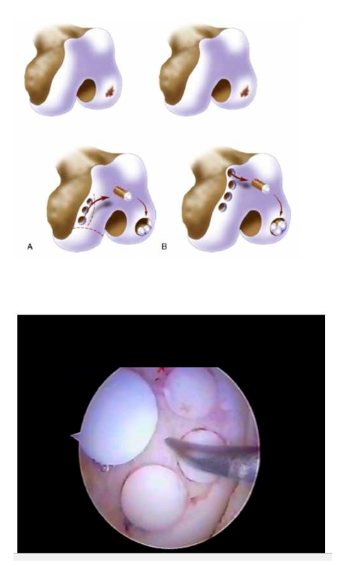 Lesões entre 1 e 3 cm: mosaicoplastia ou enxerto osteocondral autólogo. É retirado fragmentos ósseos com cartilagem de uma parte saudável do joelho e transportado para a parte com defeito.(imagem esquemática e por vídeo).